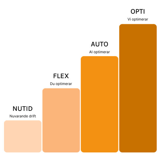 Driftoptimering sker på olika nivåer i 2Connect; från ert nuläge via FLEX till AUTO eller OPTI. Varje nivå ger bättre kontroll, lägre kostnader och smartare drift.